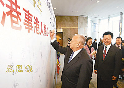 董建華出席頒獎典禮,簽名留念。 (劉國權 攝)