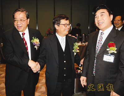 「2004年特區政府施政十件大事評選」頒獎典禮雲集城中名流,令一些平時各自忙碌、難得聚首一堂的好友碰面,得以談天說地、暢敘友情。全國政協委員、香港中華文化總會主席高敬德一見全國人大代表鄭耀棠和葉國謙兩位老友,立刻走上前與兩人緊握雙手,順便討論遲些安排「酒聚」。