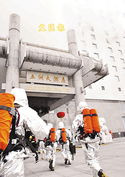 為保障「兩會」駐地的安全,北京市旅遊局和北京市消防局28日聯合在北京市五洲大酒店舉行消防演習。(新華社)