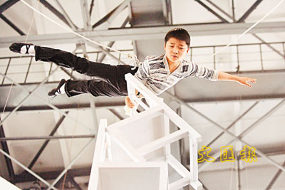 28日,一名中國雜技演員在北京市國際藝術學校的雜技學院練習椅上平衡。據悉,該所學校已為1950年成立的中國雜技團訓練超過120名青年雜技演員。 (路透社)
