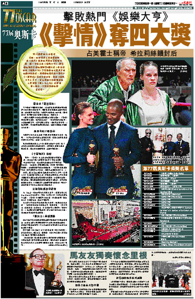 第77屆奧斯卡金像獎揭盅,由奇連伊士活自導自演的《擊情》擊敗由馬田史高西斯執導、獲11項提名的《娛樂大亨》,奪得最佳電影及最佳導演等4個大獎;慘為輸家的《娛樂大亨》只得到最佳女配角及其他製作安慰獎。競逐最佳攝影的中國影片《十面埋伏》得獎希望落空,敗於《娛樂大亨》手中,而在香港大受歡迎的迪士尼動畫《超人特工隊》延續其超人魅力,大熱贏得最佳動畫獎項。