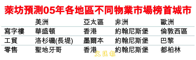 [2005-03-02] 萊坊預測05年各地區不同物業市場榜首城市