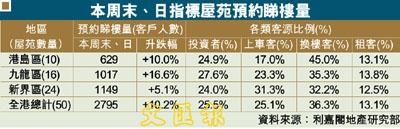客源比例方面,由於市場閒資充裕,炒家追落後及收租客「買磚頭」保值的意慾更強,本周投資者睇樓比例就高達25.5%,創去年年初旺市以後新高。個別屋苑如城市花園、海怡半島、淘大花園、美孚新h、大埔中心、嘉湖山莊的追落後效應更見顯著,投資者比例超越40%的高水平。