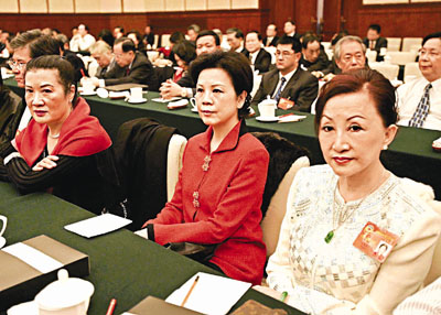 8日,出席全國政協會議的全國政協委員鄭明明(右一)、胡葆琳(右二)、黃紫玉(右三)認真聽取委員發言。(新華社)