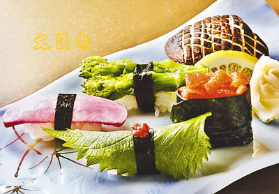 春天已到來,津田信行設計多款春意洋溢的壽司,包括紫蘇葉梅蓉壽司,撲鼻的紫蘇葉清香,跟酸梅為你的味蕾帶來新意;日本特產的赤蘿蔔及津田信行特創的蕃茄壽司,單看外觀已經春意洋溢;香燒冬菰及日式菜花壽司味道同樣清新怡人。