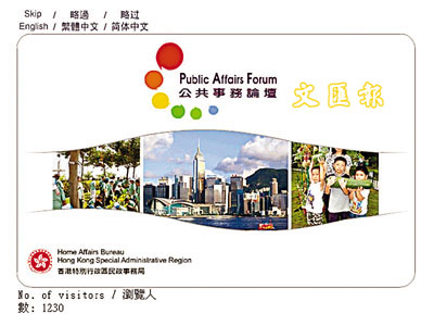 【本報訊】(記者 莊海源)特區政府昨日宣布設立諮詢論壇「公共事務論壇」,就本港重要社會議題向政府提供意見,公共事務論壇網站(見圖)也同時啟用。論壇成員主要為來自商界、專業界別及學術界,並具備專上教育程度或取得專業資格的受薪僱員。他們視自己為中產階層人士,在社會上也被認同為中產階層人士。網站設有不同的討論課題、諮詢文件及網上意見調查供成員討論及投票。現時供成員討論的課題包括對內地新來港定居人士及有關性傾向的歧視問題。