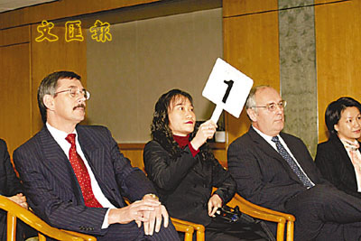 太古地產安格里(左一)及楊愷欣(手持1號牌者)親自坐陣下,終如願投得衛城坊剩餘2%業權。 (張偉民 攝)