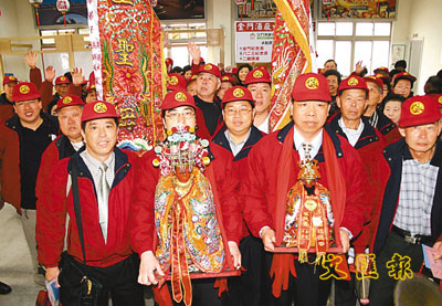 小金門上庫村供奉的保生大帝、媽祖,11日在村民護送下,自水頭碼頭小三通前往福建祖廟請火,為56年第一次回老家。 (中央社)