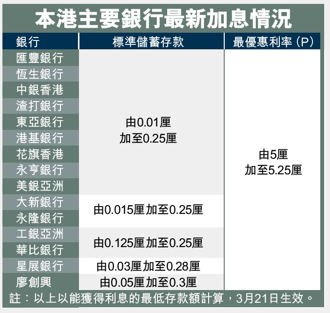 本港主要銀行最新加息情況 (圖)