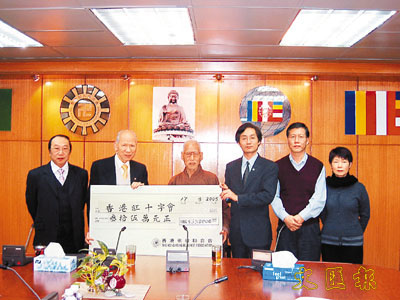【本報訊】(記者 鄭群)香港佛教聯合會日前於灣仔辦事處再次捐出35萬元給香港紅十字會作南亞賑災用,支票由佛聯會副會長黎時煖,司庫何德心及籌款發起人暢懷長老代表送出,香港紅十字會秘書長陳啟明代表接收。