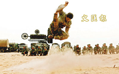 軍方出於保密理由,管制軍人使用手提電話。圖為解放軍濟南空軍某導彈部隊挺進西部沙漠演練,空閒時間,官兵進行武術表演,活躍軍營文化生活。(資料圖片)