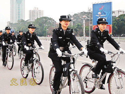南寧消息:據新華社報道,南寧市首支女子巡警隊本月20日亮相街頭,正式執行巡邏任務。20名全副武裝的女巡警吸引了不少市民目光。據了解,女子巡警隊隊員平均年齡23歲,均為大專以上學歷。女子巡警隊不僅有常規的巡邏裝備—手槍、步話機、手銬、警棍、記事本、警笛等,還有針對女巡警特點、首次投入使用的電擊器、染色噴霧器等非殺傷性警械。