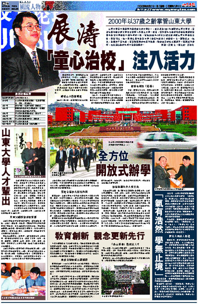 山東大學是中國最早和最負盛名的大學之一,其前身為1901年創建的山東大學堂,是當時國內繼京師大學堂之後第二所國立大學。但是,這所百年名校的現任校長展濤卻是國內重點大學校長中最年輕的一位。從他2000年7月以37歲之齡榮膺山東大學校長之位,直到現在,他一直排在國內重點大學「校長年齡榜」的最後一名。面對記者,他說,重要的不是年齡,而是對事業的執著和熱愛,對於自己的追求要賦予一種夢想和激情,也就是心態的年輕才是最重要的。