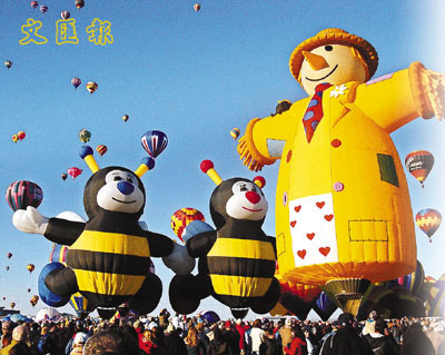 節日期間,每天七、八百個熱氣球同時在晨曦中升空,七彩繽紛的熱氣球,在藍天白雲中飄浮,這不就是一幅天然名信片嗎?當中不少形狀特別,有美式足球、肥牛、馬車、稻草人、穿梭機、乾辣椒、恐龍、酒樽、羅斯威爾外星人等,千奇百怪,令人目不暇給,有如置身於童話世界中。