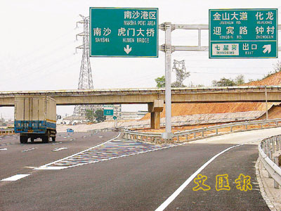 南沙港快速路主線長65公里,已於去年底開通。該路全線採用城市快速路標準,南沙大道以北為雙向八車道,以南為雙向六車道,設計行車時速80公里,可容納車流量為10萬輛,目前車流量約為每日1.5萬輛。