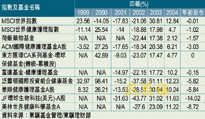 投資行業股並非易事,既要了解行業周期,亦要清楚公司的狀況,故筆者建議大家透過基金投資。泛靈頓國際投資組合健康基金以持有小型的健康護理股為主。此基金採取由下而上(bottom-up)的投資策略,並由兩位專材管理,分別是Antony Milford及Deane Donnigan。擁有博士學位的Deane Donnigan有7年註冊藥劑師經驗,對行內資料掌握充分,再加上早於1971年已加盟泛靈頓的投資專才Antony Milford,可為基金帶來不俗表現。從附表可見,此基金在大部分年份的回報均能跑贏大市,只是01及02年環球經濟表現不濟時,其回報才差過世界指數,雖然年初至今回報為-5.82%,不過,筆者覺得反而為投資者提供了入市機會。