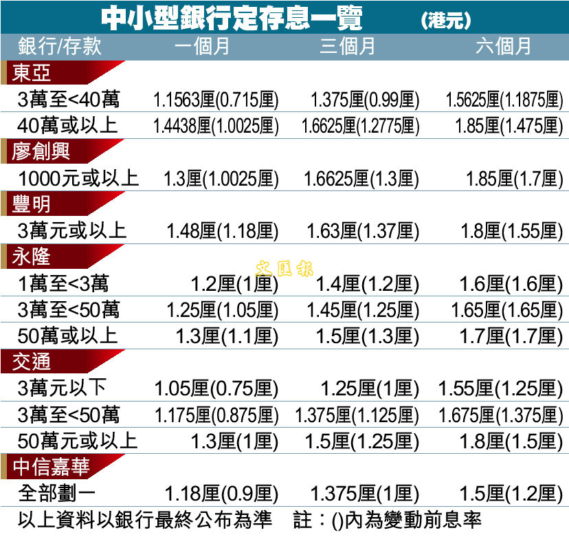 中小型銀行定存息一覽 (圖)