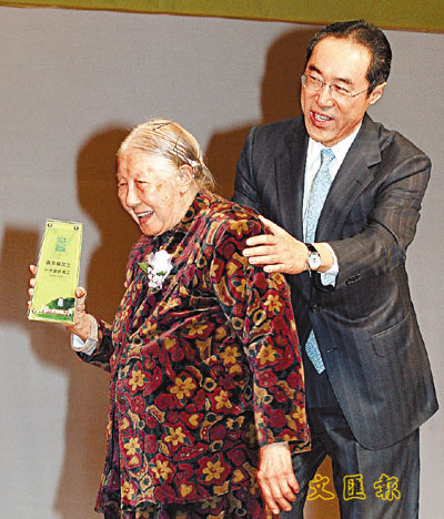 從財政司司長唐英年手中接過獎牌,義工婆婆開心不已。 (羅蘭蓉 攝)