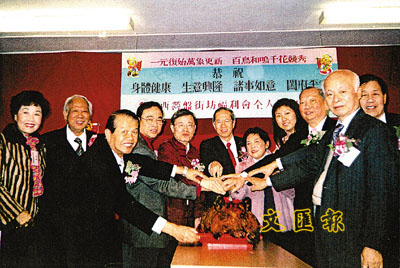 西營盤街坊會新春聯歡,王如登、陳特楚、羅嘉穎、李廣林、李鄧綺蓮主持切金豬儀式。
