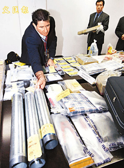 旺角警區助理指揮官(刑事)關大偉展示爆竊集團用以鑿牆的鐵通等工具。 (鄺褔強 攝)