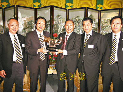陳振東(左二)從羅正富(左三)手中接過「牛虎銅案」紀念品。(羅斯 攝)