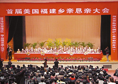 日前,美國福建同鄉會聯合28個在美國的華人華僑社團共同在福州主辦了「首屆美國福建鄉親懇親大會」。上千位福建旅美鄉親在福州表達了旅美僑胞擁護《反分裂國家法》,盼望兩岸早日實現統一的心聲,同時亦表示要更積極融入海峽西岸經濟區的建設中,為家鄉貢獻自己的力量。