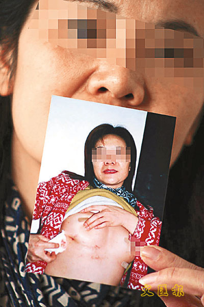 鄧小姐第二天回到香港後,便覺得胸部疼痛難忍,並伴有發燒現象。經在香港明愛醫院接受檢查,發現傷口流膿,高燒39.6℃,須住院治療。「隨後有三個多月時間,我忍著胸部流膿的痛苦,多次到深圳進行交涉,但美容店主和手術醫生強調這是手術後正常現象,隨即給我開了一些消炎藥。可他們竟連一個處方單都沒有,隨手在一個空紙箱上撕下一塊紙片應付我。」鄧小姐氣憤地說。