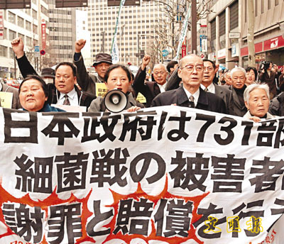 圖:22日,侵華日軍731部隊細菌戰受害者、訴訟原告何英珍(前左一)、周福菊(前右一),以及前日本律師聯合會會長土屋公獻(前右二)、731部隊細菌戰訴訟原告團團長王選(前左二)等在日本東京街頭參加遊行。受害者周福菊和何英珍在法庭上強烈要求日本政府承認侵華日軍的犯罪事實,向所有細菌戰受害者謝罪並給予賠償。 (新華社)