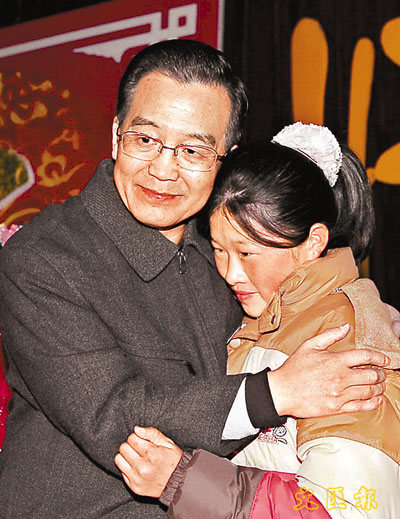 今年除夕,溫總理來到河南上蔡縣蘆崗鄉「陽光家園」,看望因愛滋病失去親人的老人和孩子,圖為溫總理深情地擁抱一個失去親人的孩子。 (資料圖片)