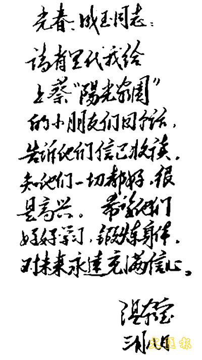 「給溫爺爺寫封信吧,告訴他咱一定會刻苦學習,長大後報效祖國。」「陽光家園」五年級班長朱永奇的這一提議,得到了全園同學一致贊同。最後,由全園寫作文最棒的魏婉麗同學執筆,向溫總理寫了一封匯報學習和生活情況的信,2月17日下午,同學們從上蔡縣郵電局把信寄了出去。