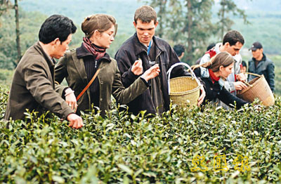 26日,杭州市龍塢村茶之語茶園的老茶農成先生(左一)指導法國留學生採摘西湖龍井茶。 (新華社)