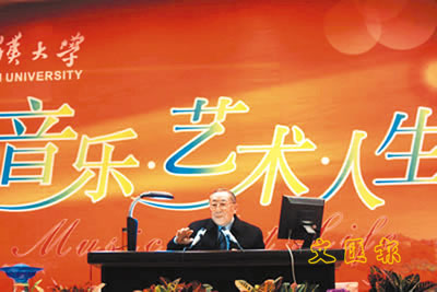 李嵐清在武漢大學講台上談音樂,論人生,娓娓道來。 (網上圖片)