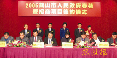 【本報訊】(記者 沈清麗)鶴山市人民政府日前假九龍香格里拉酒店隆重舉行2005年春茗暨招商項目簽約儀式。中聯辦協調部副部長孫亞清、全國人大代表吳亮星、利豐集團董事總經理馮國綸、香港鴻興印刷集團主席任昌洪、香港信華顧問有限公司主席雲大棉、利奧集團主席梁鎮華等政、商界名流雲集。當晚宴開15席,170多名鶴山市嘉賓出席,高朋滿座,非常熱鬧。