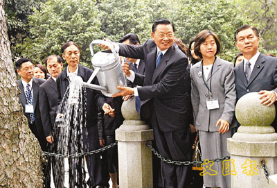 江丙坤為孫中山先生手植的松樹澆水。 (法新社)