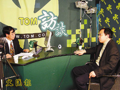 本報北京新聞中心總編輯曾書萬(左)、褚靜濤(右),作客網站談江丙坤來訪。(圖片由TOM.COM提供)