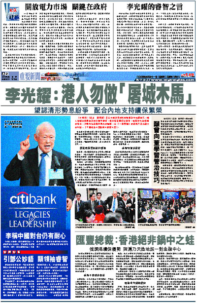 李光耀昨日在港出席一個午餐會時表示:不同地方因應其不同的時局、施政和人民意願,需要不同的領袖。在香港,特首一職並不易做,「你有一個主人在中國,有一個主人在香港,兩邊都需要兼顧,是十分艱巨的工作。」