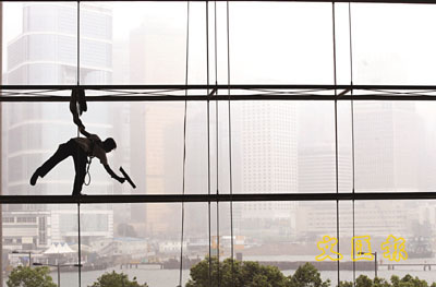 薄霧籠罩香江,玻璃幕牆沾滿霧氣,阻隔視線,需要清潔工人冒險在濕滑的玻璃牆上攀爬,抹走霧水。然而窗外的風光依然是朦朧一片。天文台預測,今日多雲,有霧及幾陣雨,晚間天氣清涼,最低氣溫約15度,最高氣溫約19度。展望隨後兩日多雲及有幾陣雨。 (劉國權 攝)