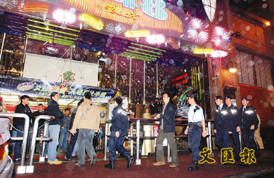 【本報訊】警方連日來針對黑幫「十×K」的「犁庭掃穴」行動。繼前晚在新界區搜查多間娛樂場所後,昨日凌晨再派出近50名反黑組探員與機動部隊警員,在油旺區多間夜總會及的士高進行高調查牌。