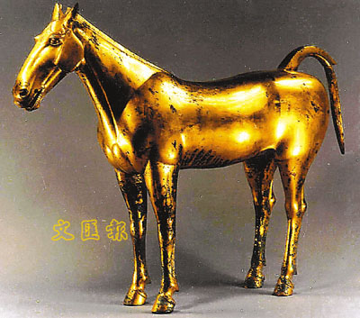 西漢鎏金銅馬,高62厘米、長76厘米,重25.5公斤。依據西域大宛汗血馬為原型製作,為國家一級文物,現藏於茂陵博物館。