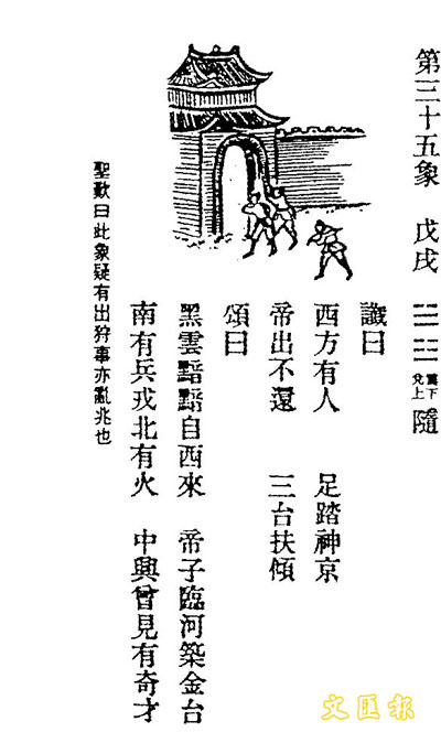 公元一八五九年,英法聯軍攻破北京城,聯軍大舉劫掠後,放火燒掉御花園圓明園。金聖歎對第三十五象只能作出以下的批語:此象疑有出狩事,亦亂兆也。(按:當第三十五象的事故發生時,金聖歎已死了二百年矣)。