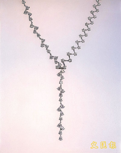 項鏈是流麗修長的白金美鑽頸鏈,採取左右不對稱的新穎設計,46顆梨形及74顆圓鑽共重超過18卡,形態高貴大方。$254,200