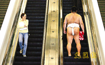 一名女子在美國相撲公開賽場中遇上露股的世界相撲冠軍加藤,露出古怪表情。(法新社)