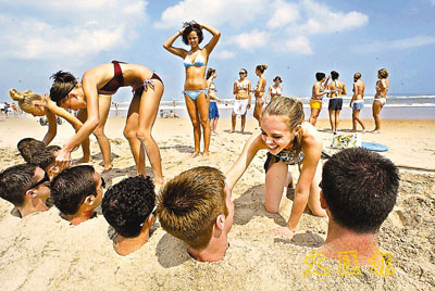 夏天還未來到,一班美國高中生已急不及待在佛羅里達州的Daytona海灘堆沙嬉玩,女生將男生們埋在沙中,只露出頭臚,然後戴上墨鏡,用照片留下荒唐一刻。(美聯社)