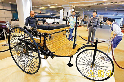 今天超高科技的平治汽車,源自百多年前的原始設計。圖為一八八六年的型號,正在曼谷國際車展展出。(法新社)