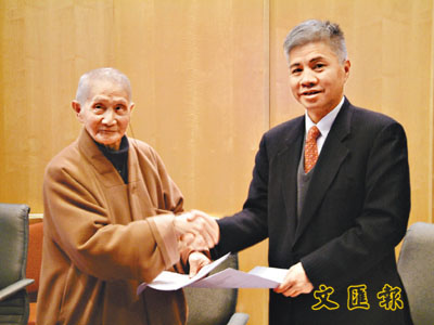 楊釗(右)與重慶有關方面簽訂備忘錄,捐一千萬人民幣修復重慶慈雲寺。 (徐家強 攝)