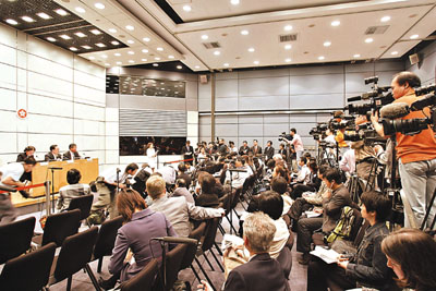 署理行政長官曾蔭權舉行記者會,宣佈特區政府決定提請人大釋法。 (潘達文 攝)
