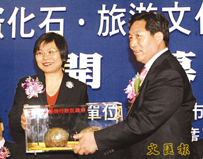 【本報訊】(記者 沈清麗)河南省南陽市「恐龍蛋化石、旅遊文化資源展示」已經在香港灣仔華潤展覽中心展出。昨天推介會上,河南省副省長史濟春親手將「國寶」——兩顆恐龍蛋化石贈送香港作為禮物。康樂及文化事務署署長王倩儀接收後表示,會將兩顆恐龍蛋化石擺放在香港科學館展出。