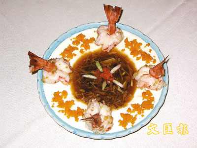 師傅先把大蝦去殼,蒜茸調味。鹹蛋黃蒸熟弄成茸。水蛋蒸熟後,將蒸熟的大蝦放在水蛋四邊,大蝦精華在蒸煮時盡入蛋中,口感滋味難忘。