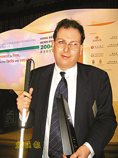 「鐵腳、馬眼、神仙肚」向來是記者的寫照,但沒想到不單沒有「馬眼」,甚至連正常視力也喪失了的《南華早報》記者Peter Kammerer,竟可憑著對新聞工作的熱誠,克服身體上的缺陷,不斷地為讀者撰寫一篇又一篇的好文章。昨天他拿著一根「導盲棒」踏上講台,接受了「2004年香港最佳新聞寫作」(英文組)的季軍獎,獲得在場者報以熱烈的掌聲。