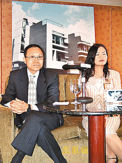 香港興業陳子明(左)及林紅表示,東涌水藍天洋房已經預留一幢,成交價2150萬元。(周穎 攝)